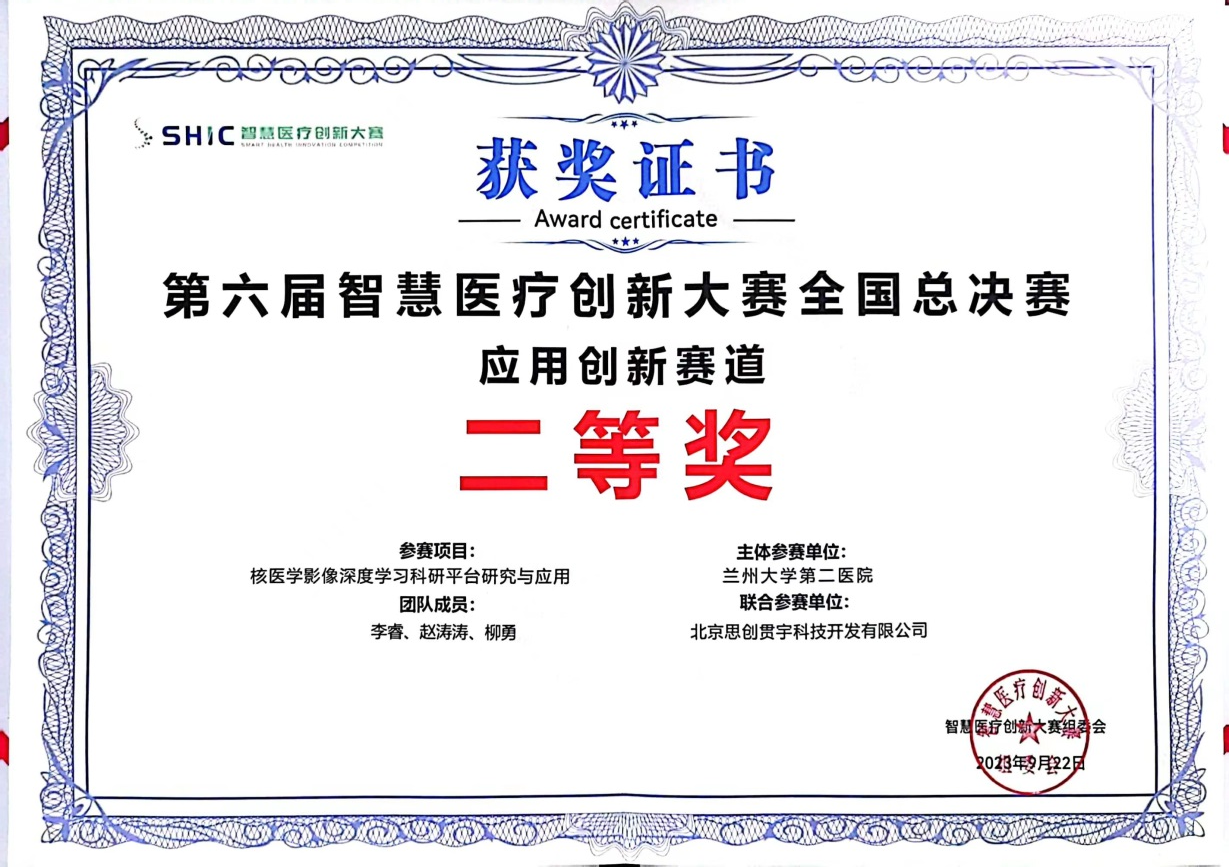 大赛汇集全国30个省市自治区的800余支参赛队伍,最终224支队伍进入全国总决赛。经过激烈角逐,兰大二院“核医学影像深度学习科研平台研究与应用”项目在决赛中获得应用创新赛道二等奖。