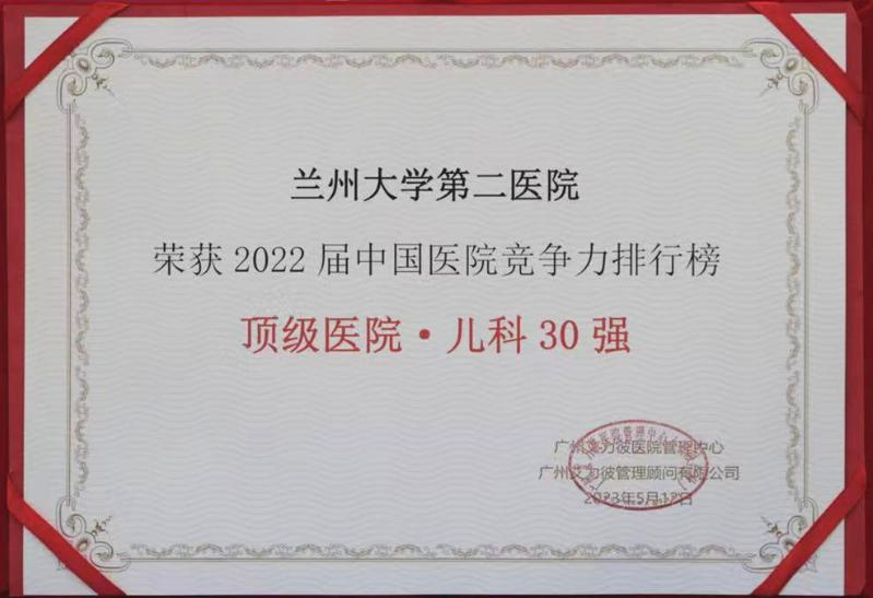 近年来,儿童医院躬耕杏林,厚植沃土,获得多项荣誉奖项。尤其是2023年在厦门召开的中国医院竞争力大会上,会议发布《医院蓝皮书:中国医院竞争力报告(2022)》,公布了“2022届顶级综合医院专科30强排行榜”,兰大二院入选“儿科30强榜单”,是甘肃省唯一上榜医院,实现了甘肃省专科排行榜“零”的突破。2023年,儿童医院荣获甘肃省优秀医师团队称号,儿童医院党总支荣获立博欧赔指数先进基层党组织称号。此外,小儿心血管科于2019年4月获批全国晕厥单元(中心),是甘肃省内唯一获批的儿童晕厥中心,2021年的《血清25-(OH)D3及RASS系统与儿童直立不耐受的相关性研究》获得甘肃省医学科技奖二等奖。2023年6月,新生儿科荣获甘肃省儿科技能大赛新生儿OSCA临床技能比赛团体一等奖。此外,小儿风湿免疫科、小儿呼吸科、儿童保健康复科等科室也获得院内多项荣誉。
