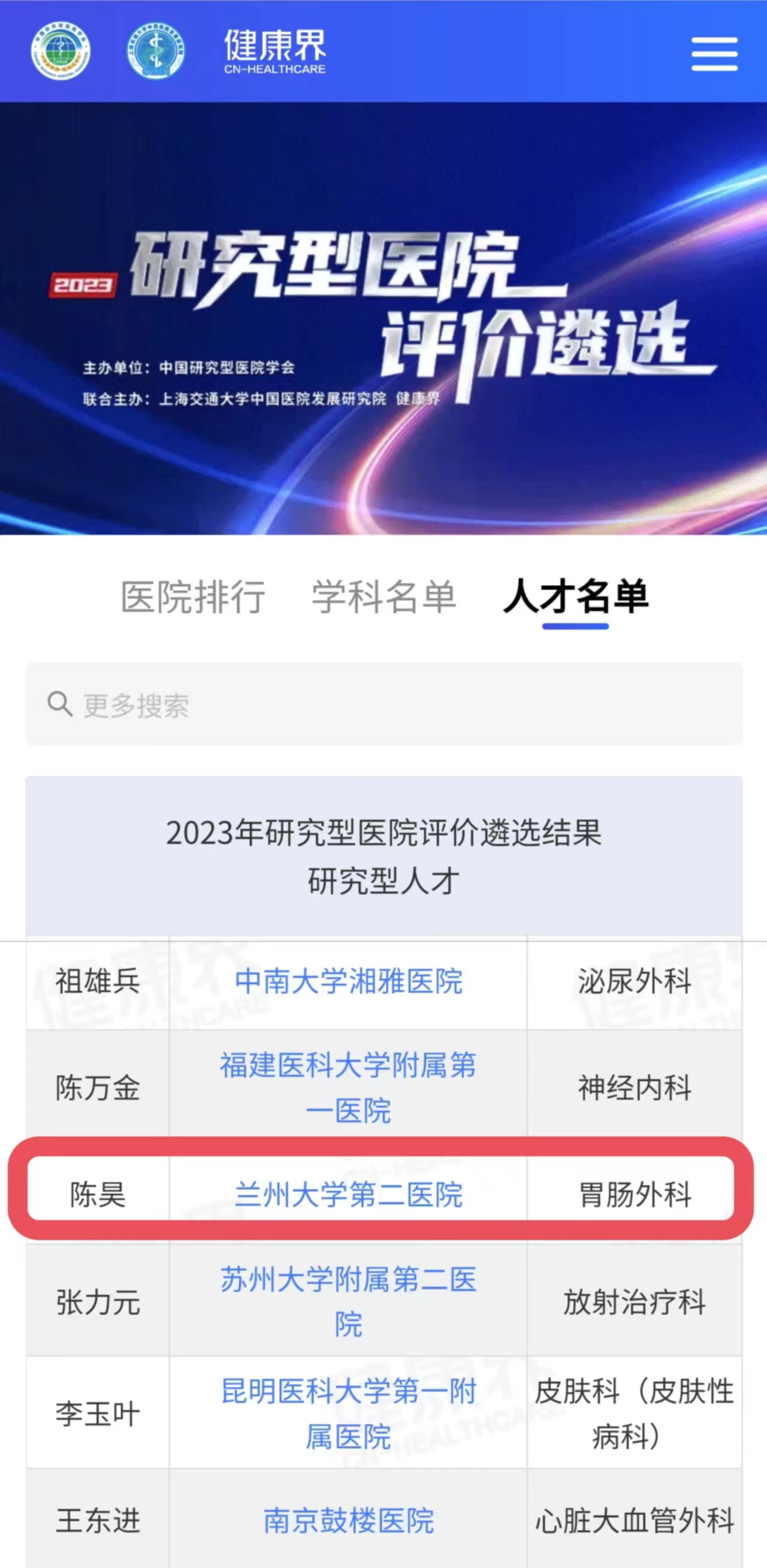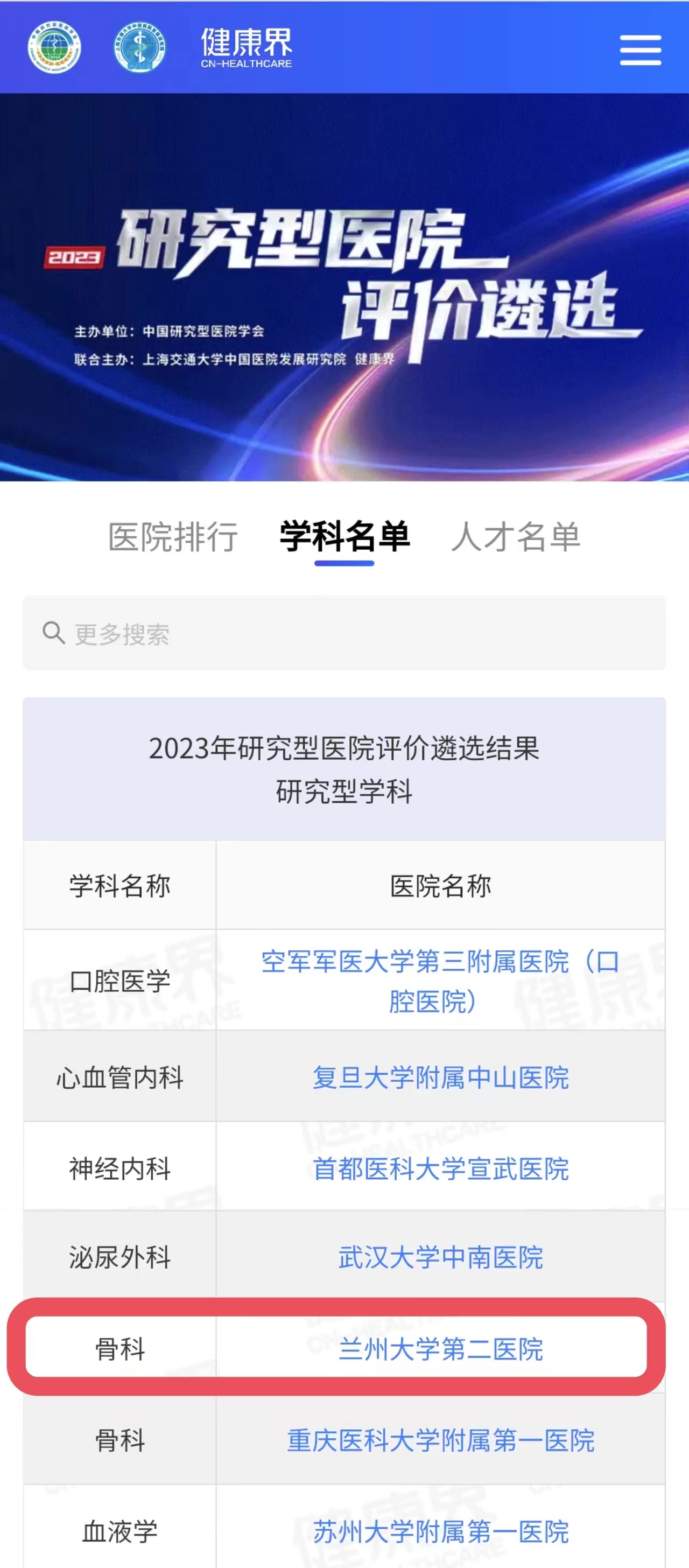 10月21日,“2023中国研究型医院高峰论坛”隆重召开,会上,发布了2023年研究型医院评价遴选结果,兰大二院入选2023年中国研究型医院建设单位,骨科入选研究型学科,聂芳教授、陈昊教授入选研究型人才。