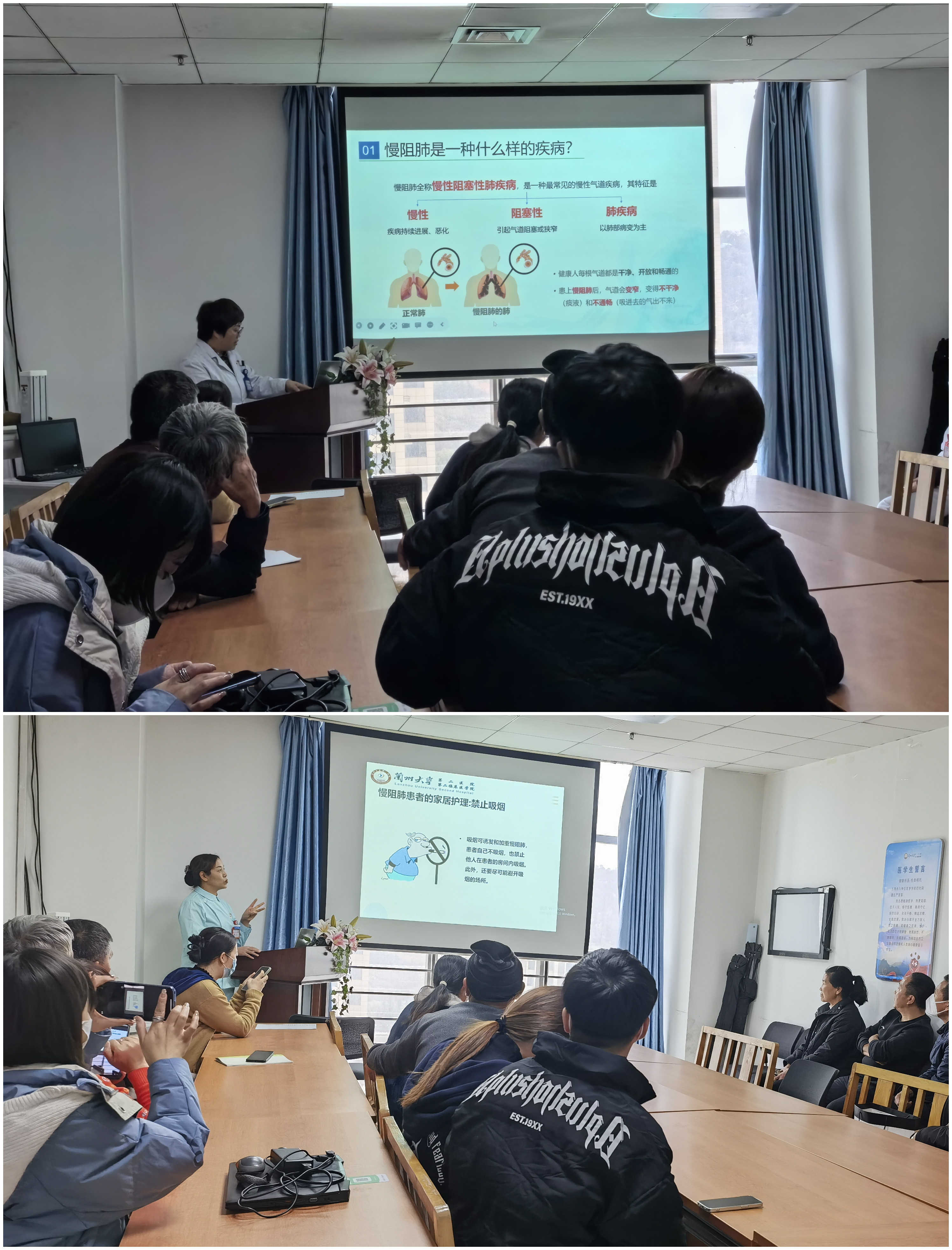 活动期间,呼吸内科副主任医师张丽、护士长李淑芳分别以《呼吸就是生命-尽早行动》和《慢阻肺稳定期的护理”为题向患者及家属宣讲慢阻肺的相关疾病知识及慢阻肺稳定期自我管理方法。同时,呼吸内科医护团队还精心组织面对面带领慢阻肺患者学习呼吸操等居家呼吸康复锻炼方式,增强患者体质,提升应对疾病的信心。