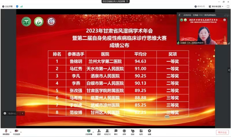 17日,举办了“甘肃省第二届风湿免疫疾病临床诊疗思维大赛”,来自省内的8名青年医生进行了精彩的病例分享。沈海丽、甘肃省中医医院苏小军、甘肃省中医药大学附属医院田杰祥、凉州区医院胡剑威、兰大二院张娟等十余位省内知名风湿病中青年专家担任评委。经过激烈角逐,最终评选出一等奖2名、二等奖和三等奖各3名,兰大二院鲁锦玥医生荣获一等奖。