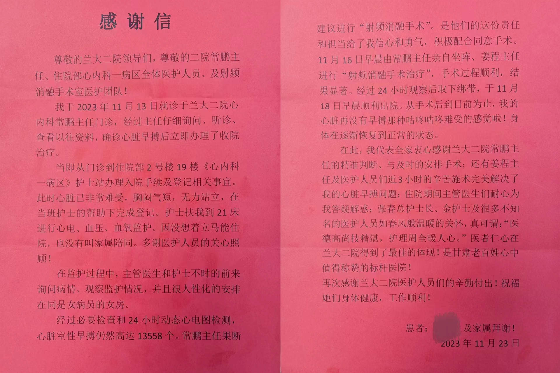 情真意切 纸短情长——一封来自兰大二院心血管内科患者的感谢信