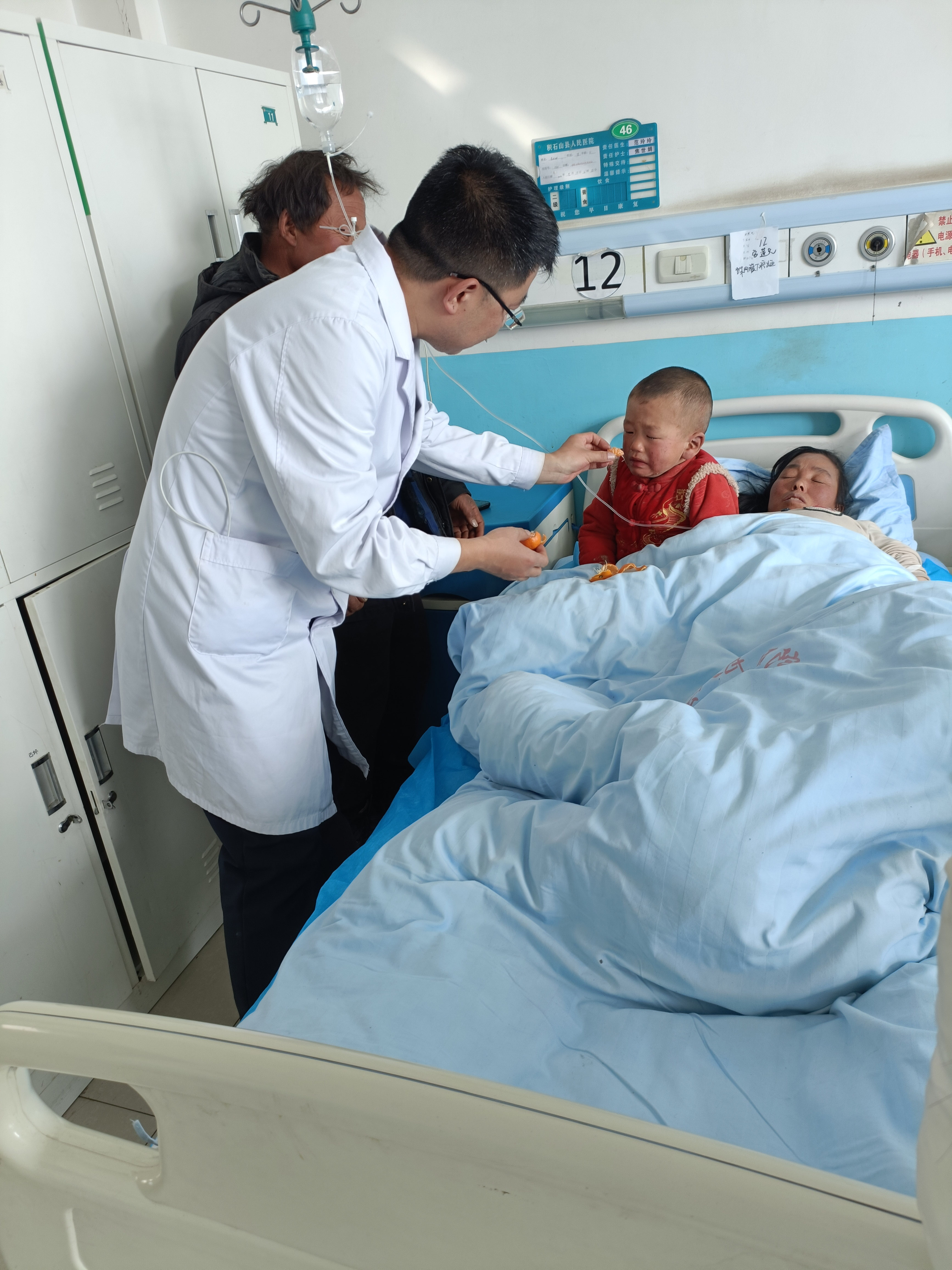 兰大二院医疗队接诊后,发现孩子因地震受到严重惊吓精神紧张哭闹不止,声音已沙哑。正当大家束手无策,一筹莫展的时侯,医疗队队员魏政勇急忙上前:“让我来看看!”他不断抚摸着孩子的额头,细声细语地鼓励孩子,同时给孩子讲故事、唱儿歌,分散孩子的注意力,让他紧张的情绪里渐渐平静下来,慢慢的停止了哭啼,约一小时后,小男孩终于在临时“宝爸”的怀里慢慢入睡,孩子的父母拉着魏政勇的手,对他连连表示感谢。