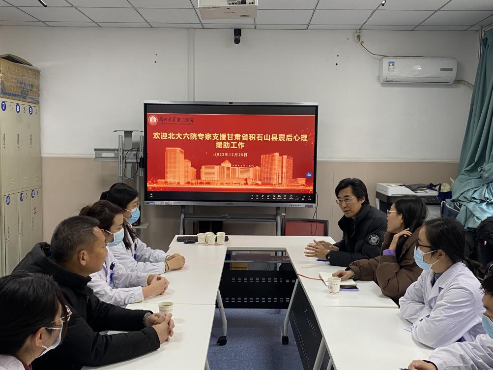 12月25日,国家卫健委心理援助督导专家北京大学第六医院主任医师西英俊、心理治疗师常蕾在甘肃省精神疾病质控中心主任、兰大二院心理卫生科副主任董强利陪同下前往省人民医院、兰大一院、兰大二院、省中医院、省中心医院5家医院就积石山县地震后转诊患者及陪同家属的精神心理状况进行评估,对心理干预实施过程中遇到的问题、困难展开讨论,并给予指导。