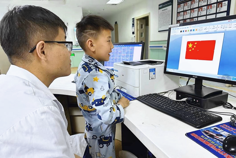 科室医护人员不仅为患者进行医疗救治,还及时关心患者及家属的生活及心理状况。一位患者的儿子在多日的相处中已和医护人员建立了良好的感情,他拉着医生共同画了一幅冉冉升起的国旗及面对国旗敬礼的小男孩的图画,小男孩激动地说:“中国人就是厉害!”他用这种方式表达对祖国的热爱以及对医护人员深深的感激之情。