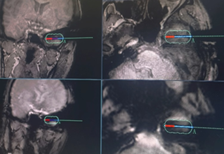 患者为30岁男性,癫痫病史长达28年,诊断为药物难治性癫痫。1年前在兰大二院行癫痫多模态术前评估,颅内立体脑电图(SEEG)结果确定为颞叶癫痫,同期行SEEG引导的射频热凝术,短期疗效良好。为了在不开颅手术的情况下达到精准和微创治疗目的,功能神经外科团队经过充分评估,联合神经内科、核磁共振科、手术麻醉科及院外专家进行了多学科讨论,制定了周密的手术方案和操作流程。术中,首先在神经外科机器人的引导下植入热凝光纤,在核磁共振设备上连接LITT设备,最后在核磁实时监测下进行激光消融治疗,直至计划毁损的组织完全消融,达到精准微创治疗目的。手术过程中患者全程清醒,无明显不适,术后患者自行步行返回病房。
