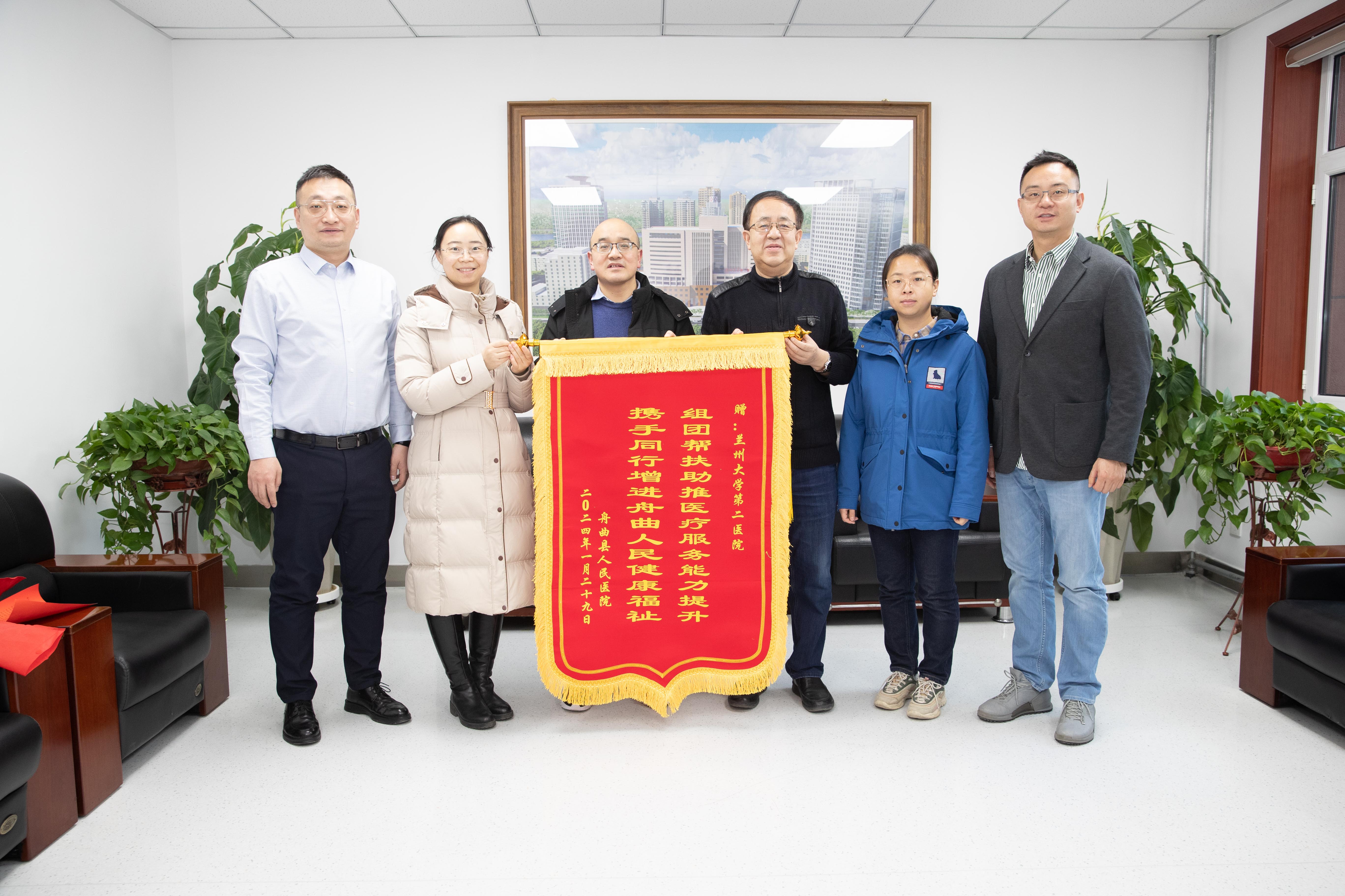 2月8日,舟曲县人民医院领导一行来到兰大二院,向兰大二院赠送“携手同行增进舟曲人民健康福祉、组团帮扶助推医疗服务能力提升”的锦旗和感谢信,对兰大二院和医疗帮扶专家给予舟曲县人民医院的真诚帮扶表示崇高的敬意和衷心的感谢。兰大二院副院长潘亚文代表医院接受锦旗。