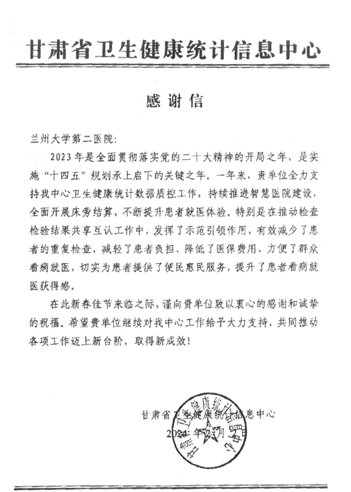 近日,兰大二院收到甘肃省卫生健康统计信息中心一封感谢信,信中对兰大二院2023年全力支持甘肃省卫生健康统计数据质控,持续推进智慧医院建设,全面开展床旁结算,推动全省检查检验结果共享互认,减少患者重复检查,降低患者负担及医保费用,方便群众看病就医等方面做出的贡献表示感谢。