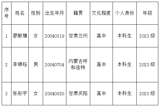 在听取党员、群众意见的基础上,经支部党员大会研究审查、学生党总支预审,拟接收廖敏婧等3名同志为发展对象。根据发展党员工作有关要求,现将有关情况公示如下: