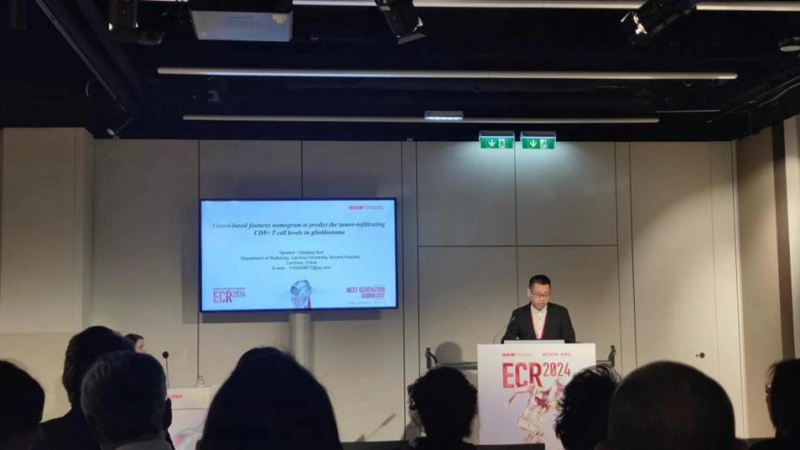 会议期间,周俊林教授博士研究生薛彩强做了题为《Vasari-based features nomogram to predict the tumor-infiltrating CD8+ T cell levels in glioblastoma》的大会发言,介绍了其在胶质母细胞瘤肿瘤浸润CD8+ T细胞水平术前无创预测的最新研究成果。此外,在本次大会共录用放射科团队论文16篇,并进行了现场电子壁报学术交流,交流内容获得了与会国内外同行的充分肯定和高度赞扬,充分展示兰大二院放射影像专业的研究水平和影像人风貌,极大提高了甘肃省在国内外医学影像领域的影响力。