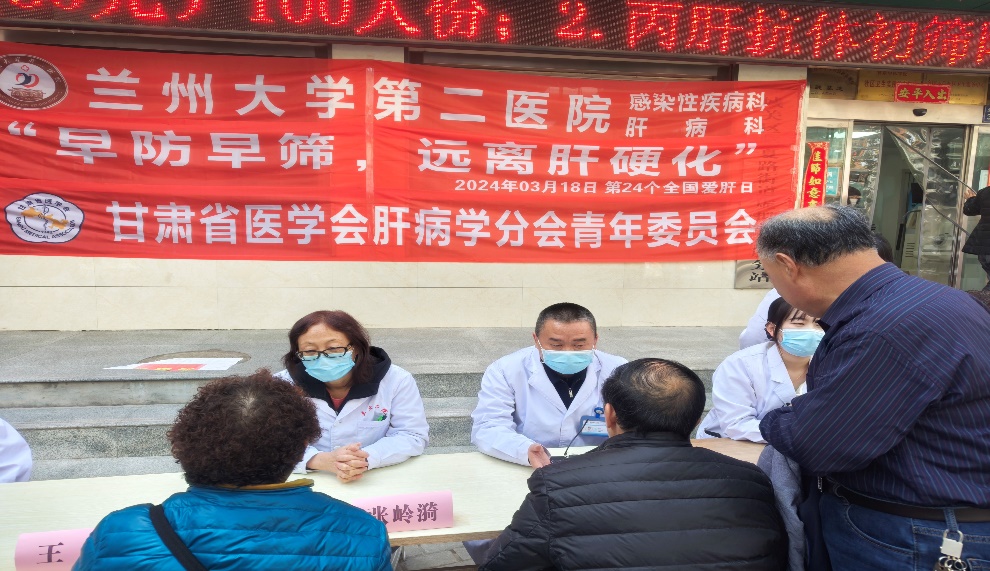 义诊中,甘肃省医学会肝病学分会主任委员肝病科张岭漪教授,甘肃省医学会肝病学分会青年委员会副主任委员感染性疾病科副主任王亮及兰大二院专家和医护团队围绕“早防早筛,远离肝硬化”活动主题,认真为每一名患者进行诊治,并对疑难复杂疾病的患者进行初步筛查和指导,同时,免费开展“乙型肝炎表面抗原快速筛检”、“丙型肝炎抗体快速筛检”。
