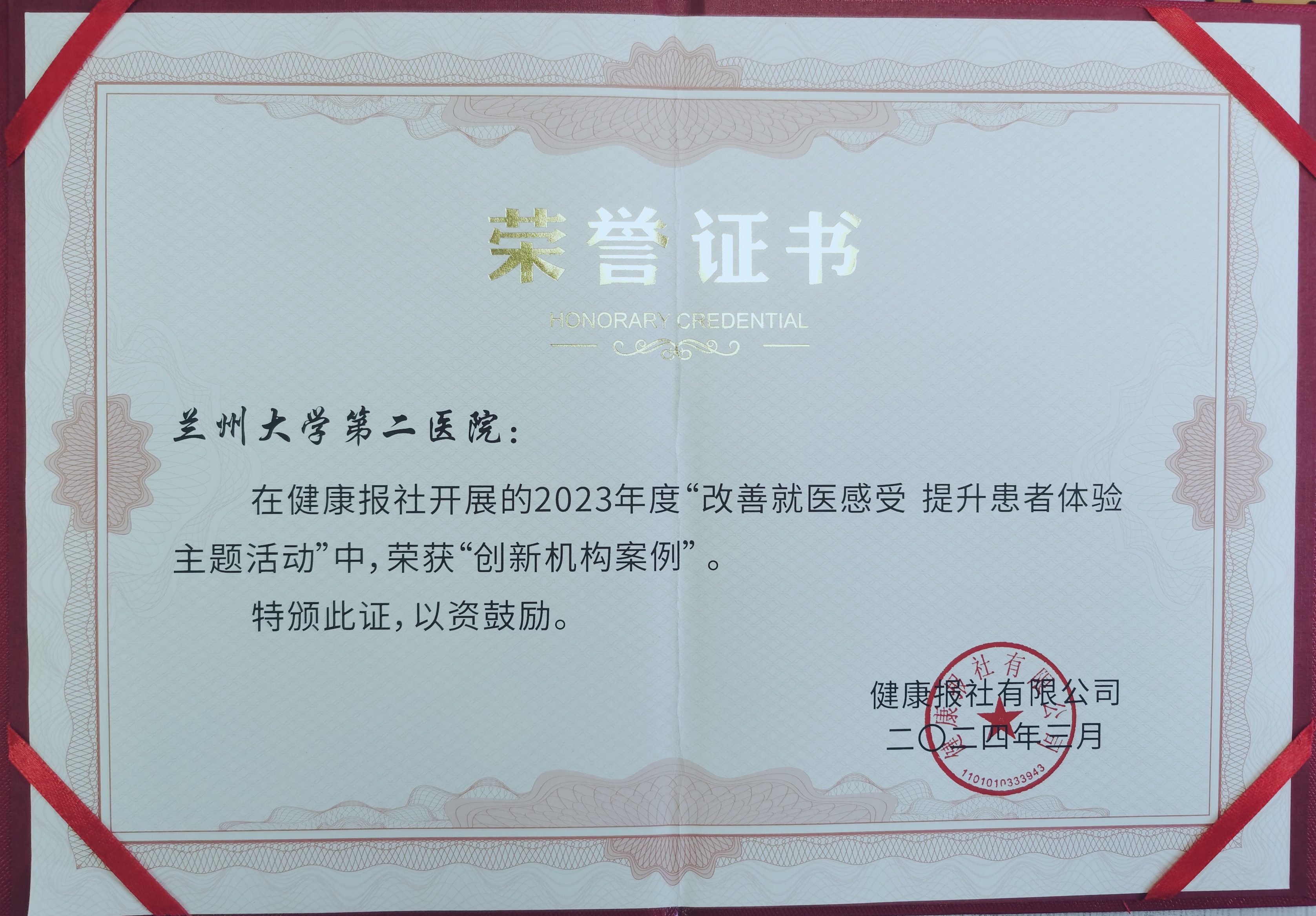 兰大二院喜获健康报社2023年度全国“改善就医感受 提升患者体验主题活动”创新机构案例奖
