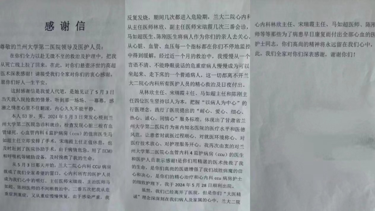 近日,心血管内科收到一面“医德高尚医术精湛,心系患者护理周到”的锦旗及一封情感真挚的感谢信,信中对心血管内科四病区(CCU)全体医护人员表达了深切的感激之情。