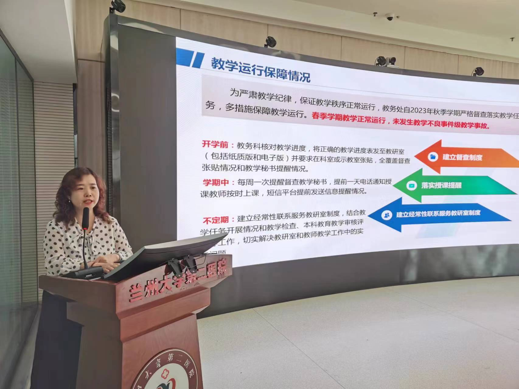 教务处处长吴嫚从教育部本科教育教学审核评估工作、临床执业医师资格考试、2024年春季学期课程运行情况、实习教学工作、2024届本科生毕业基本数据、教学建设与研究、本研贯通计划、临床技能大赛、住培基地管理等方面通报了近期教学工作情况。