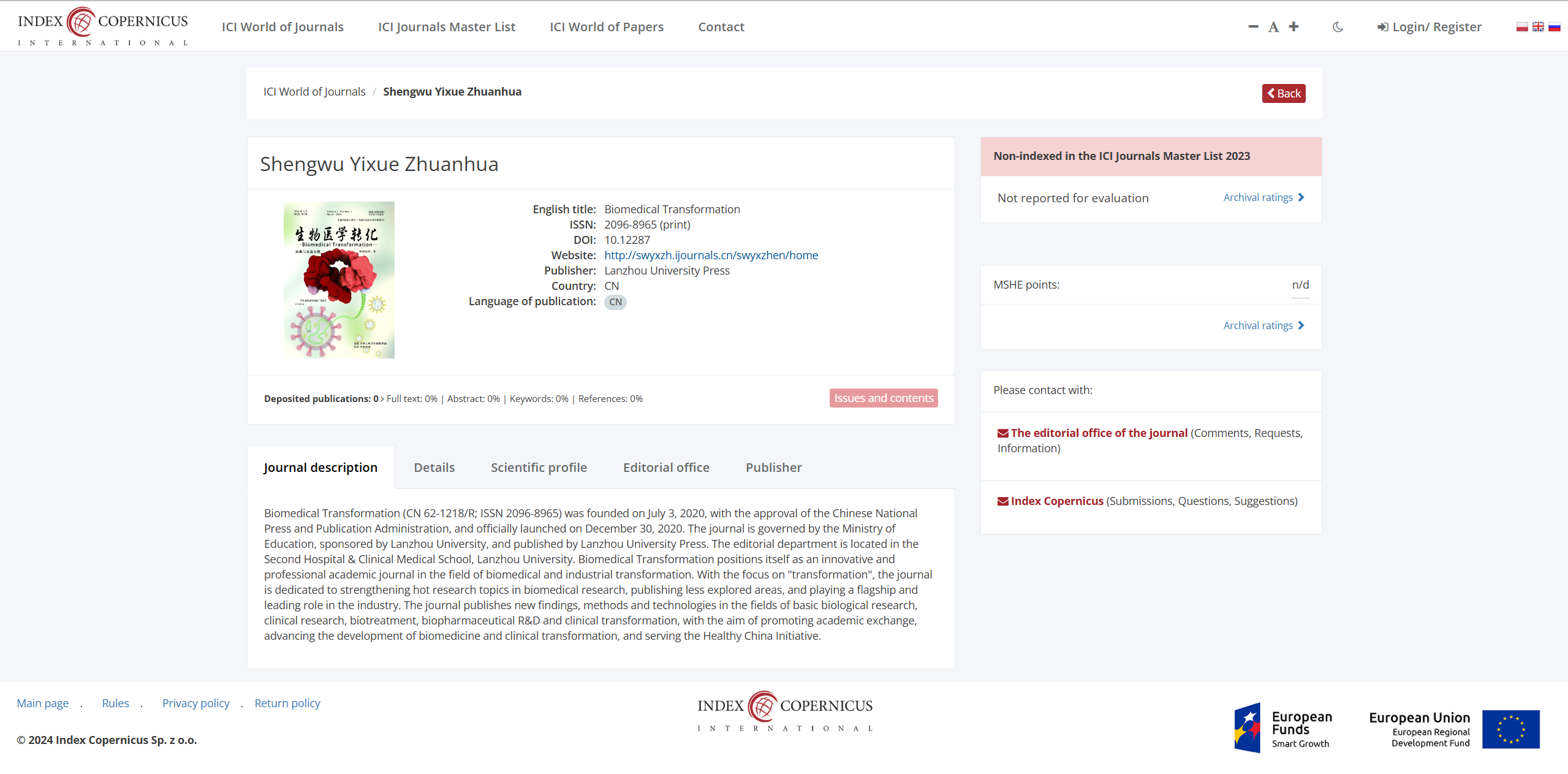 【喜讯】《生物医学转化》被波兰ICI Journals Master List数据库及美国Ulrichsweb数据库收录