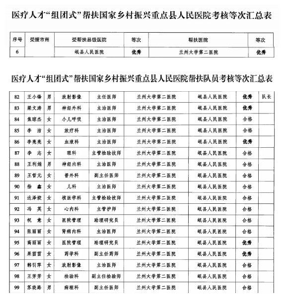 2024年6月下旬,由中共甘肃省委组织部和省卫生健康委牵头,集中对 2023年度医疗人才“组团式帮扶工作进行现场考核。兰大二院在此次考核中获得“优秀”;兰大二院“组团式”帮扶队原队长、岷县人民医院原院长王小锋,原副队长梁文涛,队员李亮亮、高丽丽、果茵茵等5人被考核评定为“优秀”,其余13人被评为“合格”。