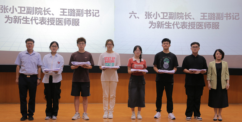 随后,杨建文、周文策为新聘任班主任颁发聘书。张小卫、王璐为新生代表授医师服。
