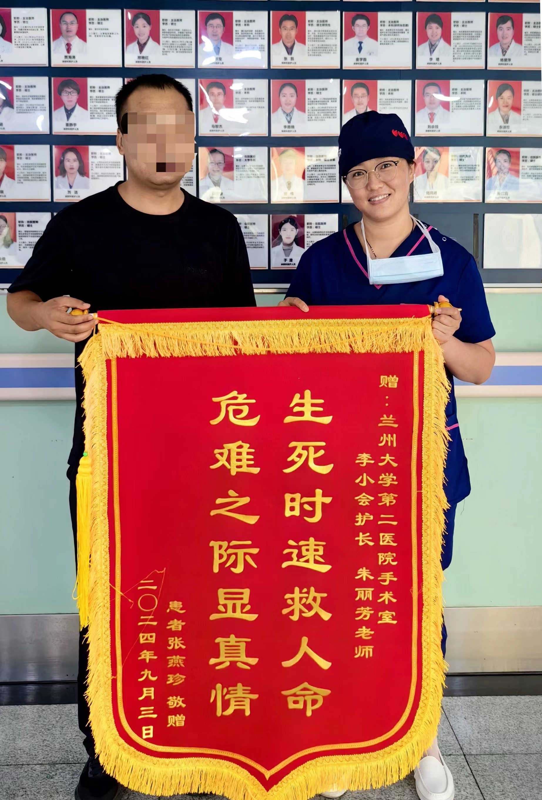 患者家属是当地一名人民警察,因工作性质特殊,在得知患者恢复视力后,他难掩激动之情,当场落泪,紧紧握住医生的手,一遍遍地说着“谢谢”。赠送锦旗时,他说“手术室的麻醉医生和专科护士都是幕后英雄,是兰大二院医护团队精湛的医术与专业的服务,让我和我的家人重新找回了生活的信心和希望。”