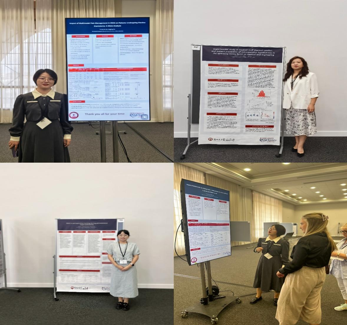 会上,普通外科三病区万润做了题为《Comparative Assessment of Skeletal Muscle Index and Sarcopenia in patients with Gastric cancer between Computed Tomography and Bioelectrical Impedance》的主会场发言,汇报了基于人体成份分析及CT在测量胃癌肌少症中的差异性和敏感性。神经外科一病区马媛媛以《Impact of Multimodal Pain Management in ERAS on Patients Undergoing Elective Craniotomy: A Meta-Analysis》为题进行卓越电子壁报交流。麻醉手术科田甜、泌尿外科三病区石晶分别以《Experimental study of medical staff thermal comfort and patient prevention of intraoperative hypothermia in the operating rooms based on medical and engineering》《ERAS in perioperative nursing during lithotripsy》为题进行壁报分享交流。