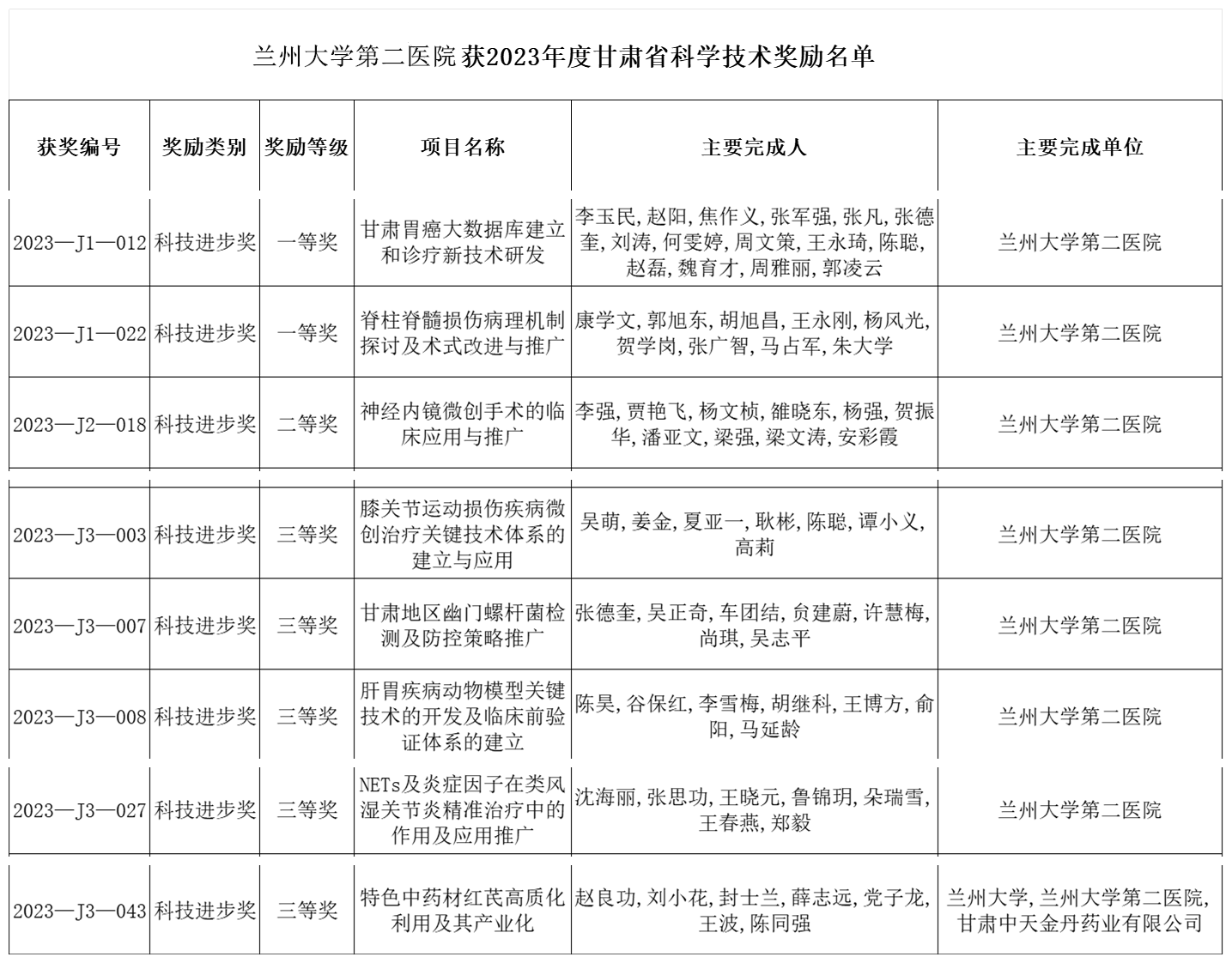 由李玉民教授主持的“甘肃胃癌大数据库建立和诊疗新技术研发”、骨科康学文教授主持的“脊柱脊髓损伤病理机制探讨及术式改进与推广”2个项目获得甘肃省科技进步奖一等奖,由神经外科李强教授主持的“神经内镜微创手术的临床应用与推广”获得甘肃省科技进步奖二等奖,由骨科吴萌教授主持的“膝关节运动损伤疾病微创治疗关键技术体系的建立与应用”、消化内科张德奎教授主持的“甘肃地区幽门螺杆菌检测及防控策略推广”、肿瘤中心陈昊教授主持的“肝胃疾病动物模型关键技术的开发及临床前验证体系的建立”、风湿免疫科沈海丽教授主持的“NETs及炎症因子在类风湿关节炎精准治疗中的作用及应用推广”、骨科赵良功副主任医师主持的“特色中药材红芪高质化利用及其产业化”等5个项目获得甘肃省科技进步奖三等奖。