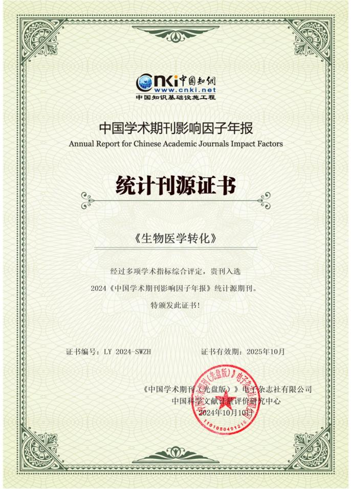【喜讯】《生物医学转化》入选2024《中国学术期刊影响因子年报》统计源期刊