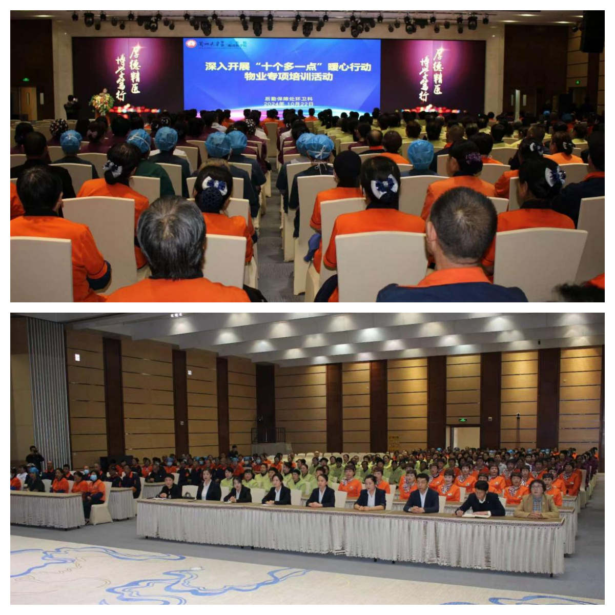 为进一步深化物业人员服务意识,提升患者就医体验,积极落实全省“十个多一点”暖心行动,10月22日,兰大二院后勤保障处开展物业专项培训。后勤保障处副处长魏志红出席会议,各物业公司负责人及员工约600余人分时段参加培训。培训由环卫科科长王建国主持。