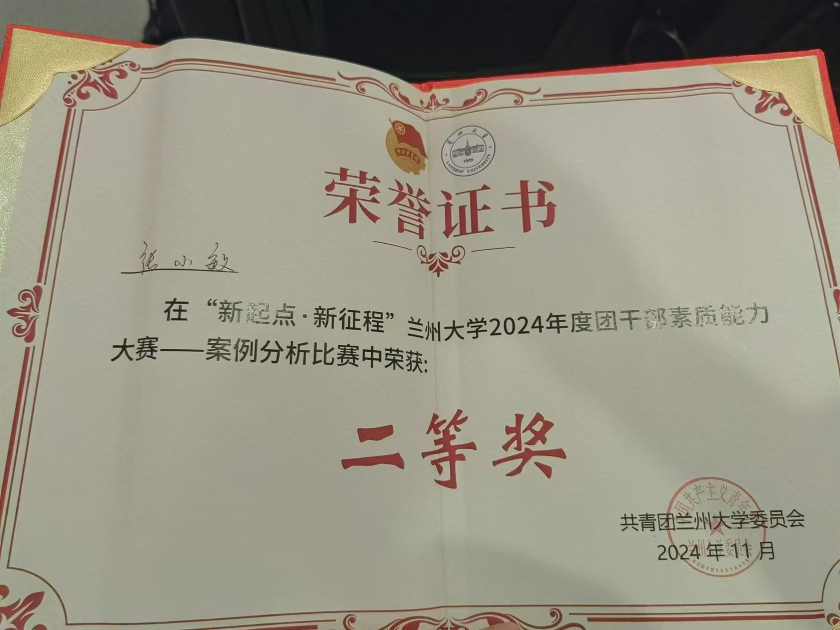 11月21日,院团委副书记张小敏代表兰大二院参加了立博欧赔指数团委举办的2024年度团干部素质能力大赛——案例分析比赛,并喜获二等奖。