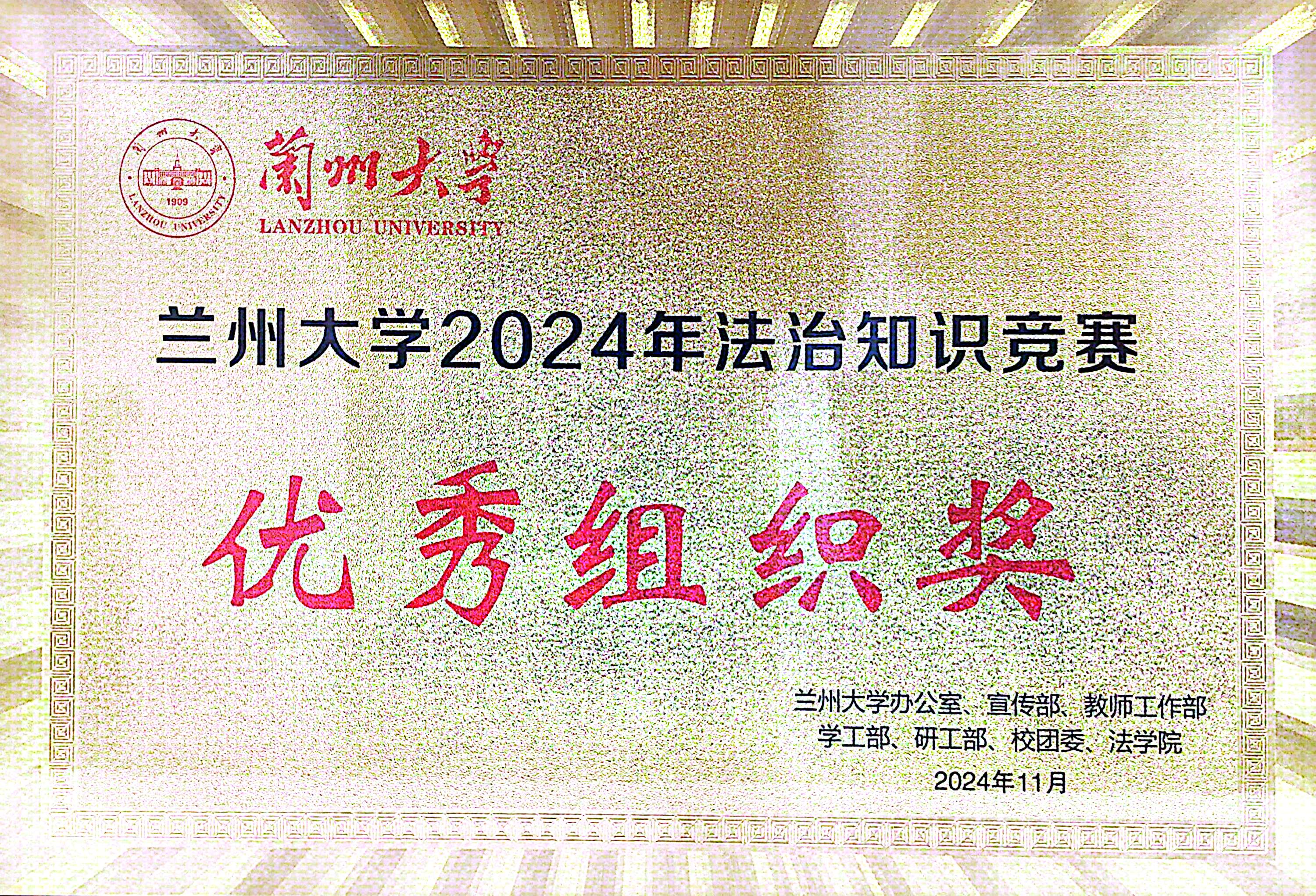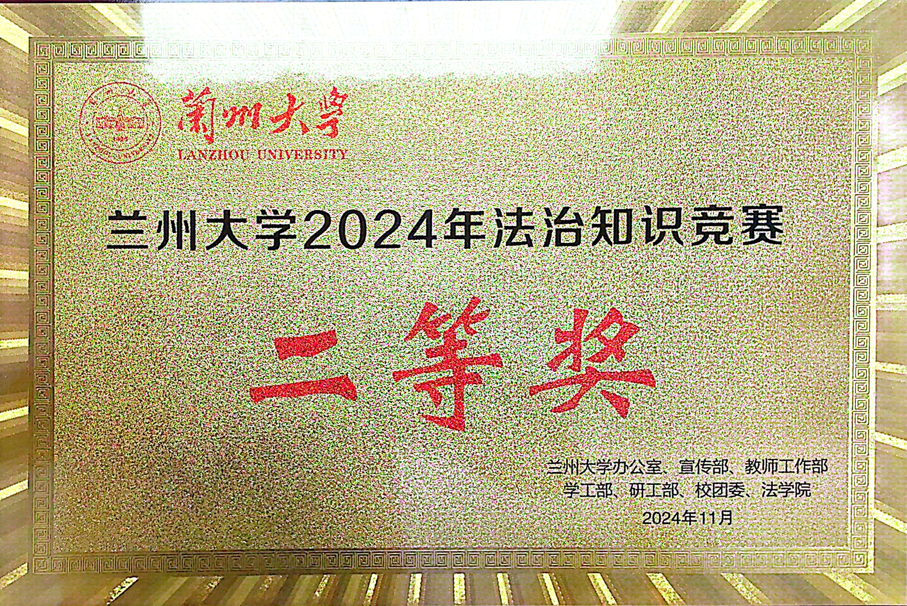 11月28日,由学校办公室、宣传部、教师工作部、学工部、研工部、校团委、法学院共同举办的立博欧赔指数2024年法治知识竞赛线下决赛在榆中校区举行。我院荣获优秀组织奖和二等奖。