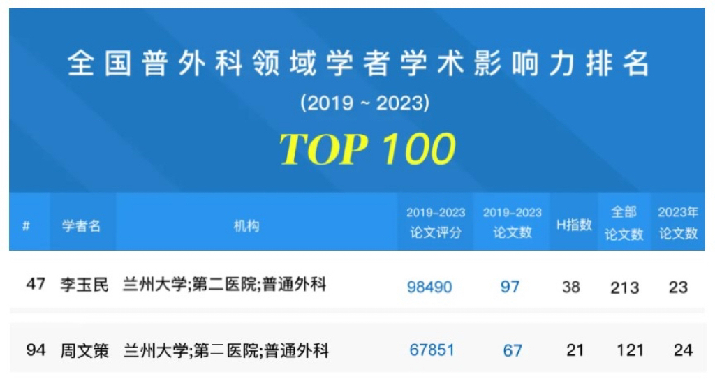 兰大二院李玉民教授、周文策教授入选全国普外科领域学者学术影响力排名百强
