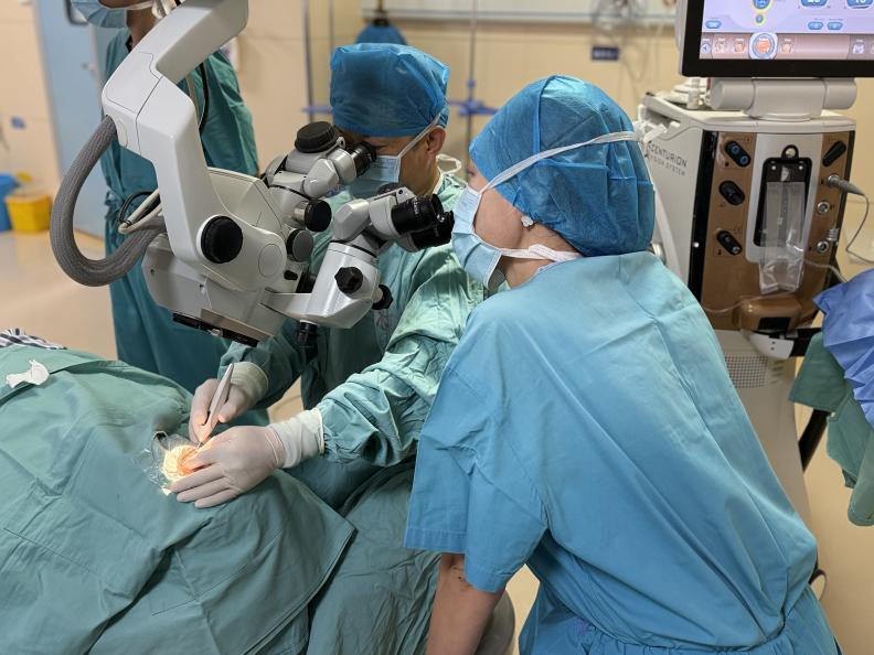 术前,团队对患者进行了全面的检查和评估,制定了详细的手术方案。术中,律鹏主任操作精准、将iStent inject W 准确植入了患者的鼻侧小梁网中,长驻新加坡的美国Glaukos公司新加坡/中国总监Christy Ren女士及两位技术专员亲临手术室,进行技术支持,确保了所有的手术顺利完成。术后,四位患者的眼压均得到了有效控制,视力得以提升,术后反应轻微,无需使用降眼压药物。