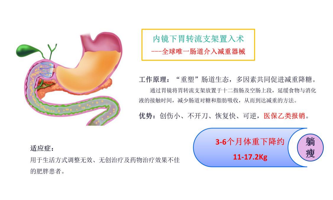 目前,兰大二院已构建涵盖生活方式干预、药物治疗、内镜微创治疗及减重手术的全方位诊疗体系。其中,兰大二院消化内科开展的十二指肠支架转流术(Duodenal Bypass Stent,DBS)能为肥胖患者提供创伤更小、恢复更快的创新治疗选择。十二指肠支架转流术通过改变食物与消化液的混合路径,影响肠道激素分泌,实现减重效果。与传统减重手术相比,该技术无需开腹操作,支架3个月后可经内镜取出,特别适合BMI在28-35之间的中重度肥胖患者。同时,该技术具有可逆性特点,能为肥胖治疗提供"过渡性选择",特别适用于需术前减重患者或手术高风险人群。