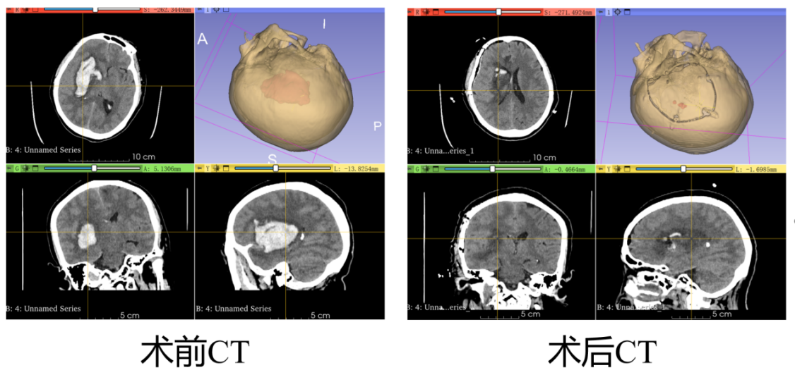 患者女,55岁,因“突发意识障碍11小时”入院。经查体发现,患者神志昏迷,GCS评分E1VTM4,左侧肢体肌力0级,右侧肢体肌力4级,左侧巴氏征阳性。头颅CT显示,患者右侧侧脑室旁-基底节区-颞叶存在出血情况,血肿量约34mL。高血压脑出血手术方案有多种选择,目前,经侧裂-岛叶入路是对患者脑皮层、白质传导束、血管等损伤最小的手术方式。神经外科侯博儒主任医师团队经过多学科专家分析讨论,认为应在早期进行血肿清除,解除压迫并消除后续血肿吸收过程中的继发损害,决定实施经外侧裂基底节脑出血显微清除术清除血肿。手术术程顺利,术后患者恢复良好。
