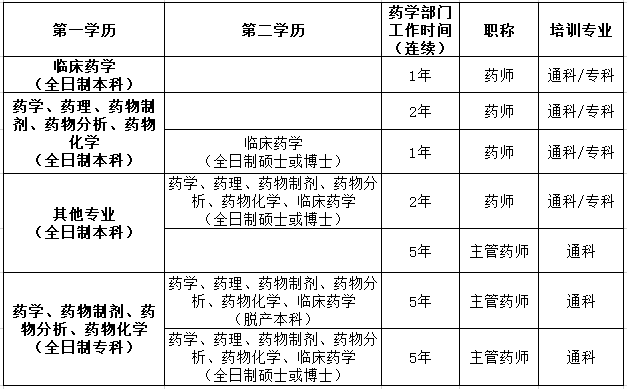 1. 医疗机构的药师报名参加临床药师培训,应具有高等医药院校或综合性大学药学院系的临床药学、药学、药理、药物制剂、药物分析、药物化学专业全日制本科及以上学历。其中,临床药学专业毕业人员应在医疗机构药学部门从事药学工作满1年;药学、药理、药物制剂、药物分析、药物化学专业毕业人员应在医疗机构药学部门从事药学工作满2年,并取得药师及以上专业技术职务任职资格(具体要求见表1和表2)。