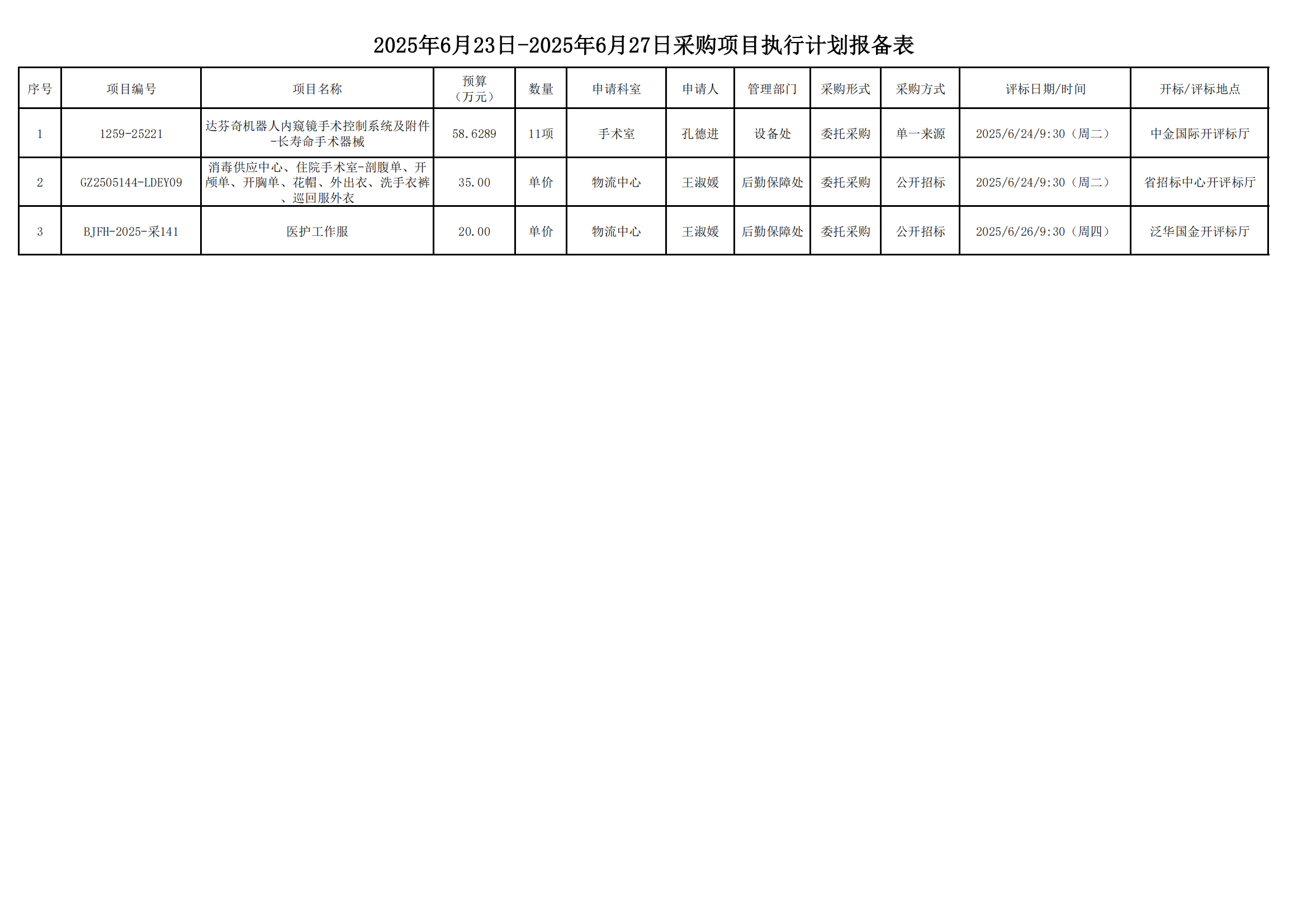 2025年6月23日-2025年6月27日采购项目执行计划报备表