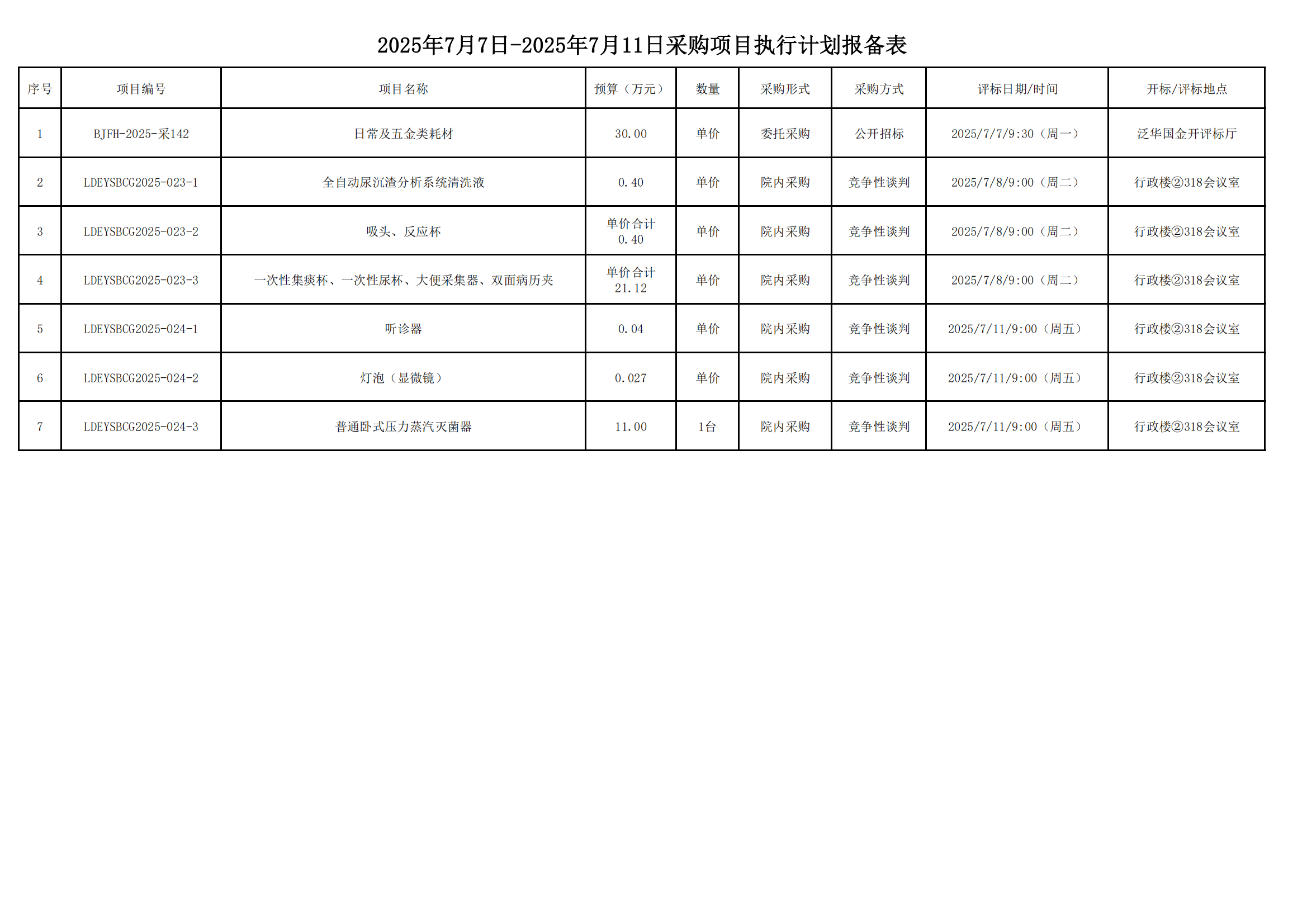 2025年7月7日-2025年7月11日采购项目执行计划报备表