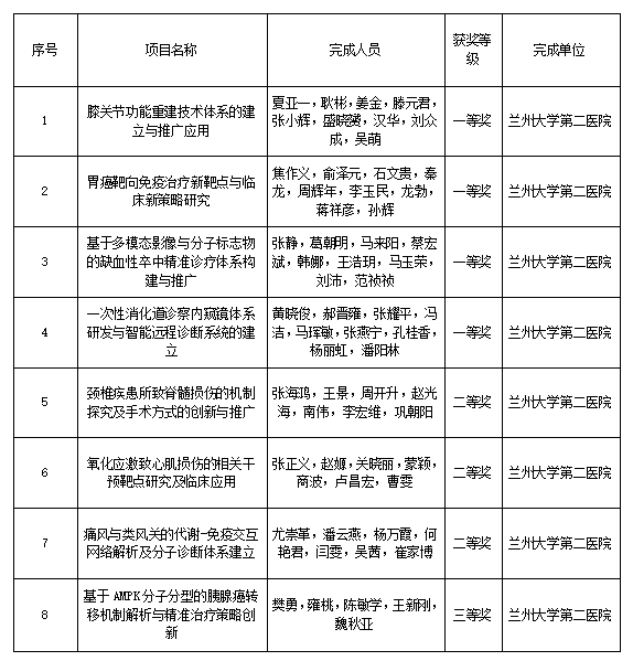 立博欧赔指数第二医院2025年度甘肃医学科技奖获奖项目