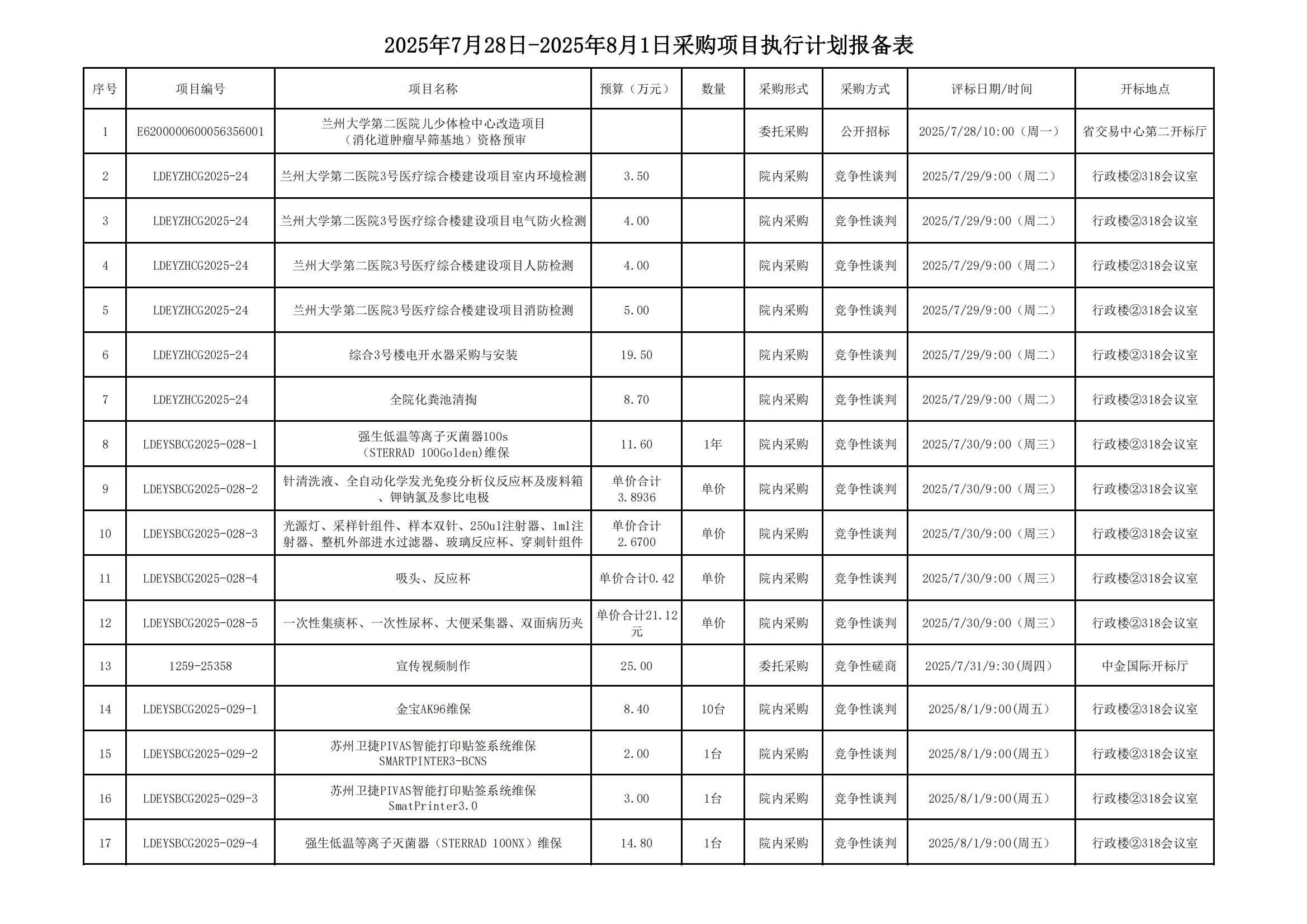 2025年7月28日-2025年8月1日采购项目执行计划报备表