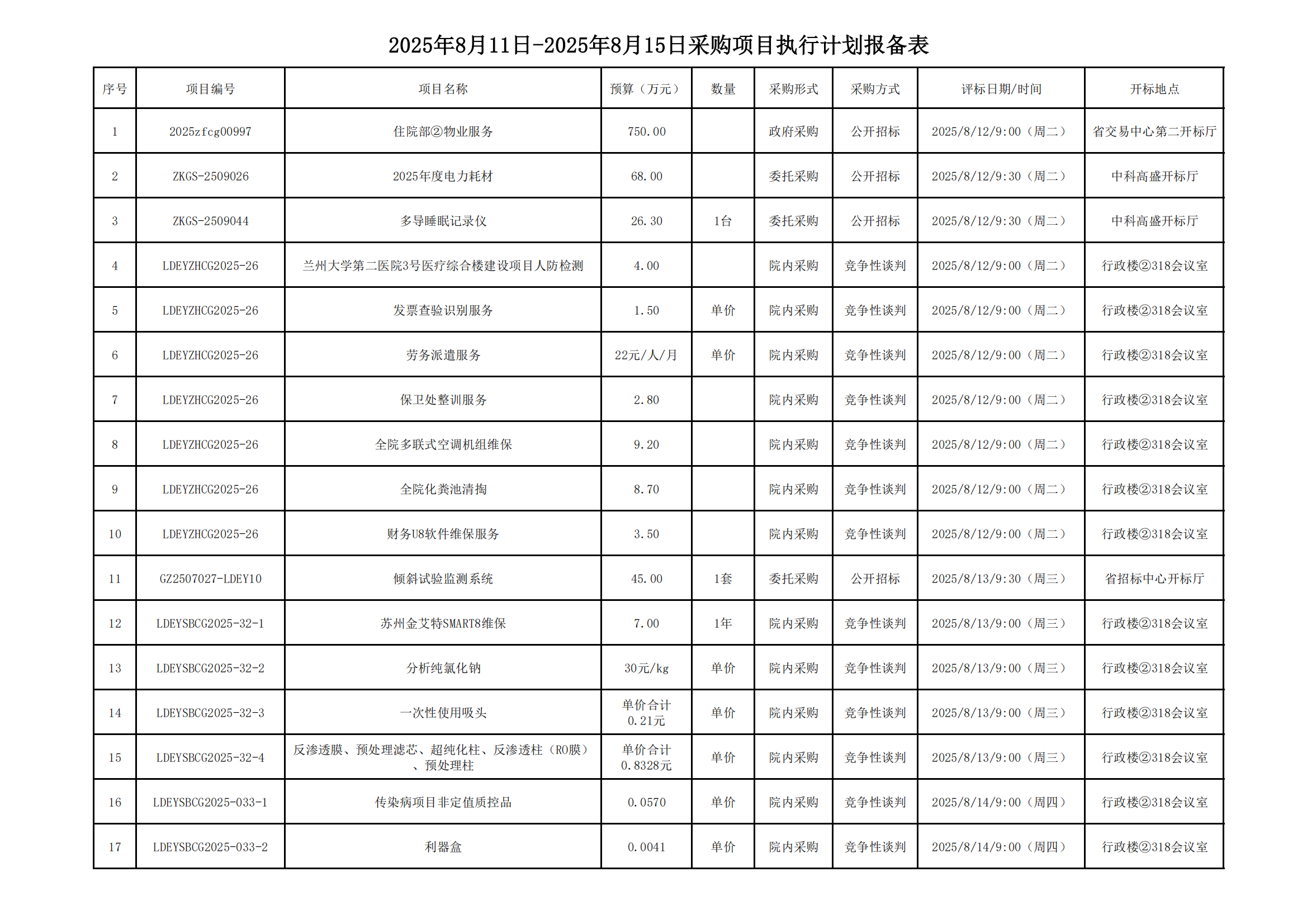 2025年8月11日-2025年8月15日采购项目执行计划报备表