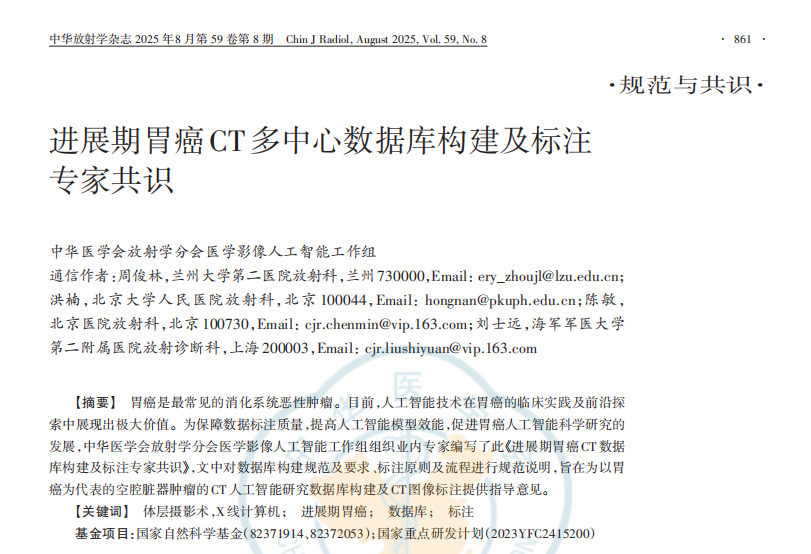 《进展期胃癌CT多中心数据库构建及标注专家共识》面向进展期胃癌的多中心影像大数据建设,制定了伦理审批、多中心协作、数据采集与脱敏、结构化标注和质量控制等统一规范。明确了病例纳排标准、全周期多期相CT采集要求、临床病理数据和随访信息的整合方式。通过覆盖全国多地区的多中心数据体系,旨在提高AI模型的泛化能力与鲁棒性,推动胃癌影像AI在分期及预后评估中的临床转化。