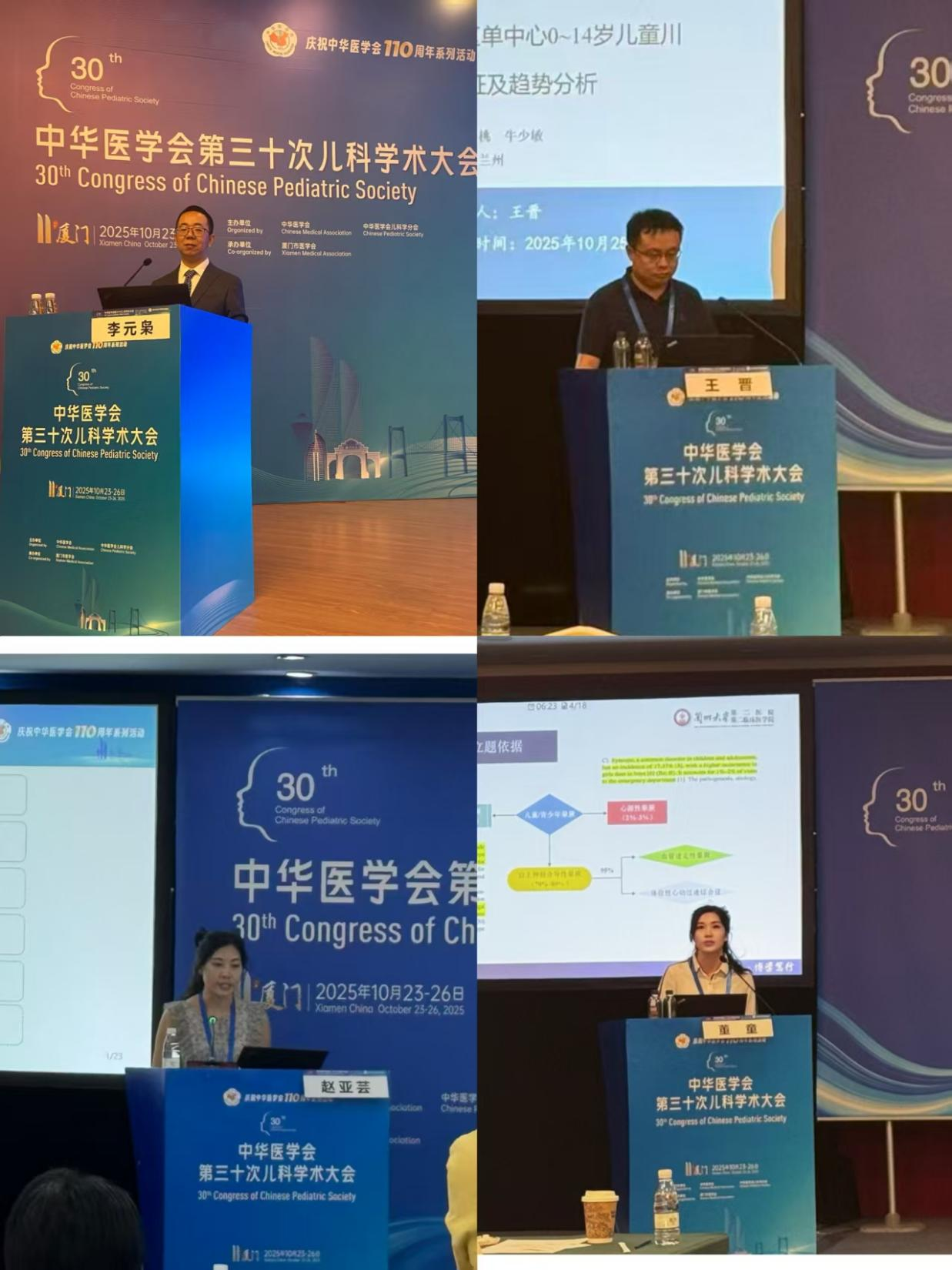 在成果展示环节,小儿神经科主任陈永前以《甘肃省婴儿/儿童脑外伤患者的病因分析及防治对策研究》为题、小儿心血管科主任王晋以《2012—2024年西北地区单中心0-14岁儿童川崎病流行特征及趋势分析》为题、护士长赵亚芸以《生成性学习策略下的BOPPPS教学模式在儿童重症临床实践教学中的应用研究》为题、小儿消化科李元枭医师以《功能性消化不良可成药基因孟德尔随机化研究》为题、小儿心血管科董童医师以《极低频功率对维生素D治疗儿童体位性心动过速综合征疗效的预测价值》为题,分别在小儿神经、小儿心血管、小儿消化、继续教育-护理等分会场进行口头交流,内容兼具临床实用性与学术创新性,赢得了与会专家的高度关注。此外,王晋主任还成功当选中华医学会儿科学分会第十九届委员会心血管学组成员,进一步提升了医院在儿科心血管领域的学术影响力。