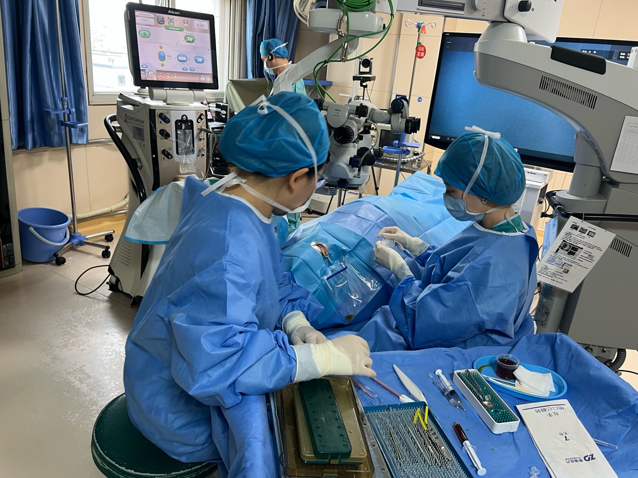 会议创新采用“学术讲座+现场手术直播+Dry Lab实操” 三位一体的形式,内容聚焦真微创青光眼手术技术前沿。在学术讲座环节,专家团队围绕 iStent inject W术式的临床应用、适应症选择、围手术期管理等核心议题开展5场专题分享,深入解读该技术在微创青光眼治疗中的优势与实践要点;手术直播环节,团队成功演示2台“iStent Inject W 联合白内障超声乳化手术”,实时呈现手术操作细节与关键技术难点,线上线下参会者通过互动提问实现深度交流;同步开设的iStent Inject W植入手术 Dry Lab实操环节,为参会医师提供模拟训练机会,助力理论知识向临床技能转化。