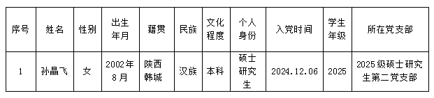 在听取党员、群众意见的基础上,经支部委员会研究审查、学生党总支预审,2025级硕士研究生第二党支部孙晶飞同志按期转为中共正式党员。根据有关要求,现公示如下: