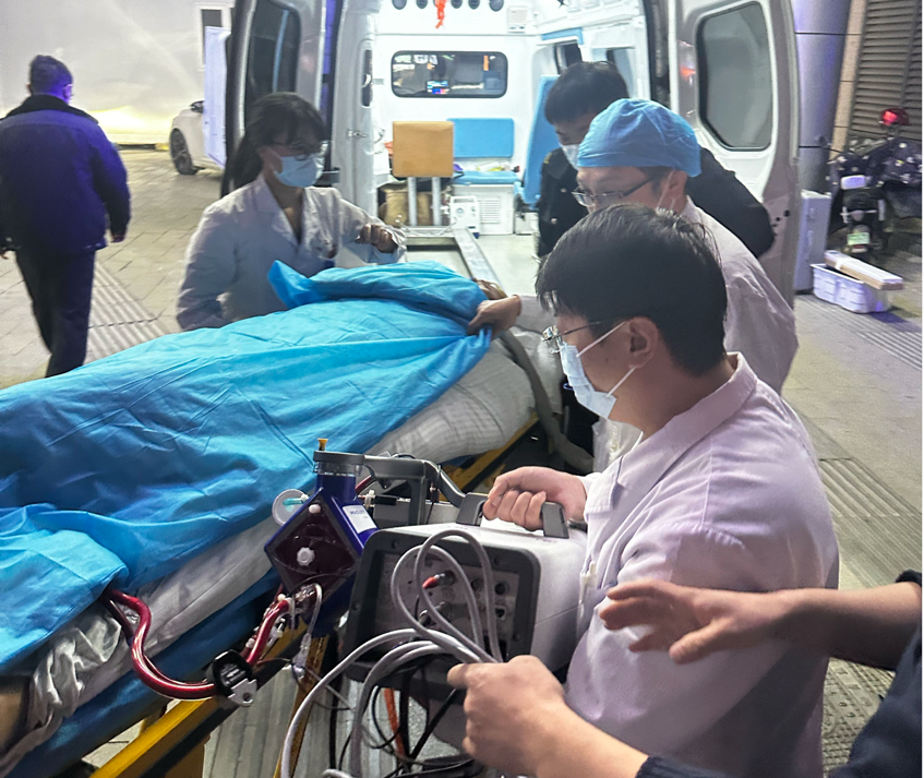 近日,兰大二院重症医学科三病区医护团队成功完成一例高难度院外生命救援任务。由病区副主任王炜带队,李明哲副主任医师及赵伟永、贾玉琴、王海彬三名护理骨干组成的ECMO转运团队,携带移动体外膜肺氧合(ECMO)设备,前往外院为一名罹患食管癌合并急性呼吸窘迫综合征(ARDS)的患者,成功实施床旁ECMO置管术,并将其安全转运至兰大二院重症医学科三病区,接受进一步高级生命支持治疗。此举实现了科室在院外ECMO转运救治领域的“零突破”,充分彰显了兰大二院急危重症救治体系强大的辐射能力与高效的团队协作水平。