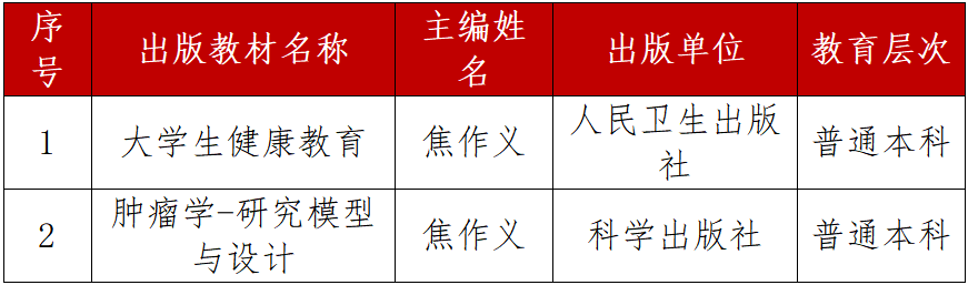 近日,甘肃省教育厅公布了第二批甘肃省“十四五”普通高等教育、职业教育规划教材书目和建设项目名单,兰大二院焦作义教授主编的本科生教材《大学生健康教育》《肿瘤学—研究模型与设计》两部教材成功入选。此次入选是学院在临床医学专业建设、教材发展以及教学实践等方面取得的重要成果,标志着医院(临床医学院)在医学教育创新与内涵建设上的持续深耕与突破,对提升人才培养质量、推动医学教育高质量发展具有积极意义。