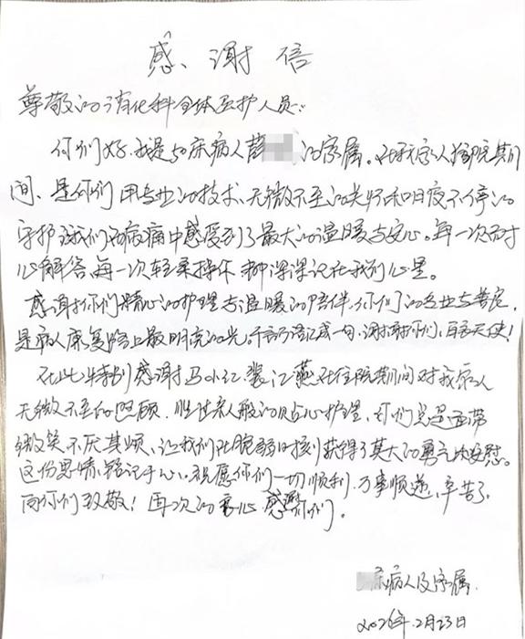 纸短情长暖人心——一封感谢信见证“护理温度”