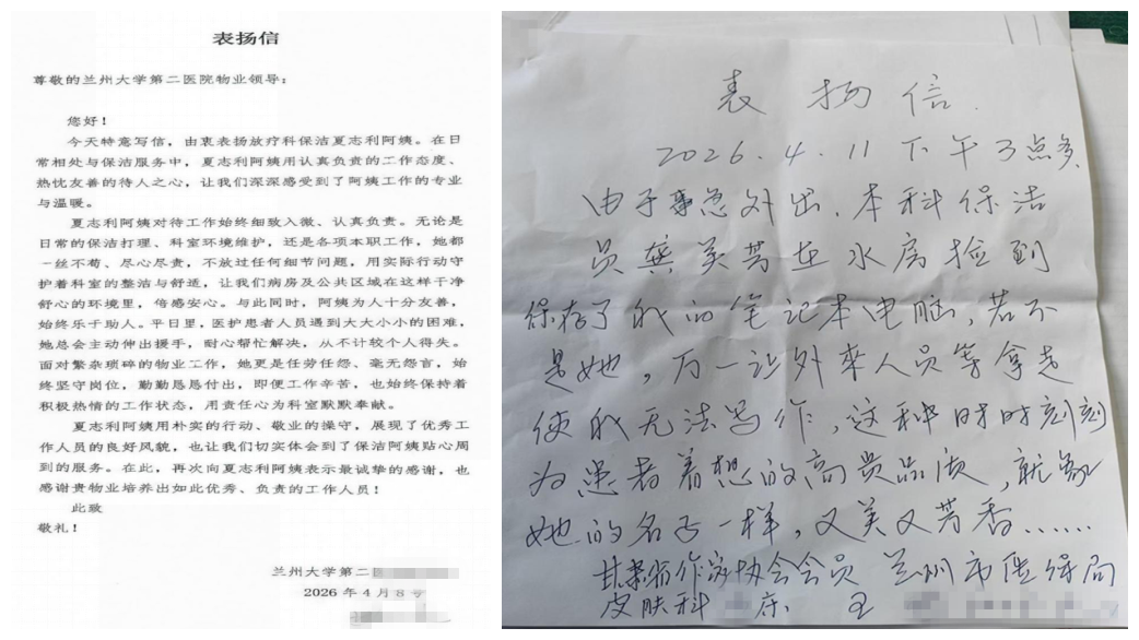平凡岗位显担当,细微之处见精神。夏志利、龚关芳两名物业工作人员在日复一日的坚守中,用敬业奉献诠释责任,用真诚善意温暖人心。她们不仅展现了兰大二院后勤服务人员的良好精神风貌,更传递了爱岗敬业、诚信友善的社会正能量。医院全体后勤人员将以她们为榜样,立足本职、履职尽责,用更优质、更贴心的服务,为医院高质量发展贡献后勤力量。