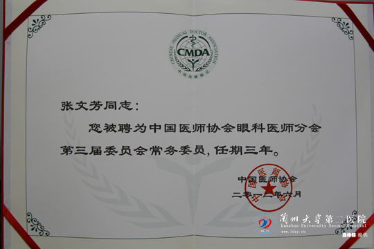 兰大二院张文芳同志当选中国医师协会眼科医师分会第三届委员会常务委员