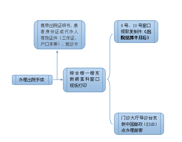 3、需邮寄病历者,请于出院结算当日前往综合楼门诊大厅东侧,中国邮政(EMS)设点处预约办理。